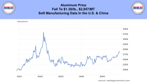 Aluminum price fell to $1.30/lb. $2,857/MT on soft manufacturing data in the U.S. & China.