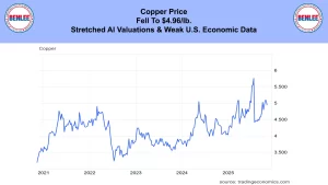 Copper price fell to $4.96/lb. on stretched AI valuations and weak U.S. economic data.