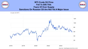 WTI crude oil price fell $59.75/b. on fears of oversupply. Sanctions on Russian oil are not yet major issue.