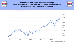 Wall Street’s Dow Jones Industrial Average fell 575 point to 46,987 on soft U.S. and global economic data. Also, on near record low consumer sentiment.