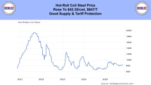 Hot-Rolled coil steel price rose slightly to $42.35/cwt, $847/T on good supply and tariff protection.