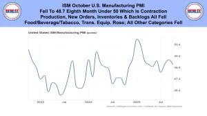 ISM October U.S. manufacturing PMI fell to 48.7 the eighth month under 50 which is contraction. Production, new orders, inventories, and backlogs fell. Food, beverage, and tobacco as well as transportation equipment rose. All else fell.