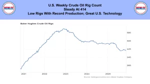 The U.S. weekly crude oil rig count was steady at 414. Low rigs with record production is due to great U.S. technology.
