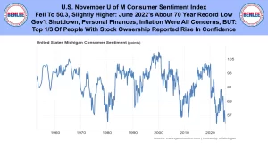 U.S. November U of M consumer sentiment index fell to 50.3, slightly higher than June 2022’s about 70 year record low. The Gov’t shut down, personal finances and inflation were all concerns. The top 1/3 of people of stock ownership reported a rise in confidence.