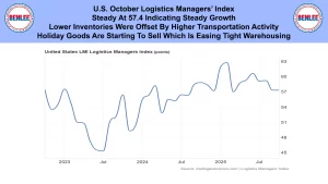 U.S. October logistic Managers’ Index was steady at 57.4 indicating steady growth. Lower inventories were offset by higher transportation activity. Holiday goods are starting to sell, which is easing tight warehousing.