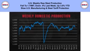 U.S. weekly raw steel production fell to 1.74MT down .4% from last week and up 3.0% year to date. This was on slow U.S. manufacturing and steel tariff protection.