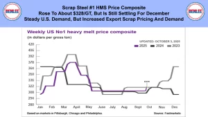 Scrap steel #1 HMS price composite rose to about $328/GT but is still settling for December. This was on steady demand, but increased scrap export pricing and demand.