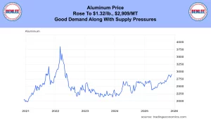 Aluminum price rose to $1.32/lb., $2,909/MT on good demand along with supply pressures.