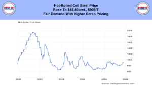 Hot-Rolled coil steel price rose to $45.40/CWT. which is $908/T. on fair demand with higher scrap pricing.
