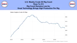 The U.S. weekly crude oil rig count rose to 413. The rig count remains low as great technology brings high production per rig.