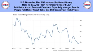 U.S. December University of Michigan consumer sentiment survey rose to 53.3 up from November’s record low. People felt better about personal finances, especially younger people. People felt better about jobs, but are still concerned about high prices.