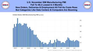 U.S. November ISM manufacturing PMI fell to 48.2 the lowest in 4 months. New orders, deliveries and employment all fell as costs rose, but categories like data centers and computers are booming.