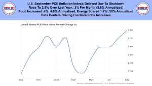 U.S. September PCE inflation index, which was delayed due to the shutdown. It rose 2.8% over last year and .3% for the month, which is 3.6% annualized. Food increased .4%, which is 4.8% annualized and energy soared 1.7% for the month, a 20% annualized rate. Data centers are driving electrical rate increases.