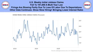 U.S. weekly initial jobless claims fell to 191,000 a multi-year low. Firings are slowing partly due to loss of labor due to deportation. Other data continues to show slow hiring, which is bringing lower interest rates.