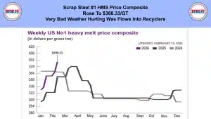 Scrap steel #1 HMS price composite rose to $388.33/GT as very bad weather was hurting flows into recyclers.