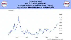 Aluminum price fell to $1.40/lb., $3,095MT on possible reduced aluminum tariffs coming. Higher prices are inflationary to U.S. manufacturers.