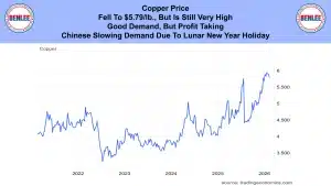 Copper price fell to $5.79/lb., but is still very high. This was on good demand, but profit taking. Also, on Chinese demand slowing due to their Lunar New Year holiday.