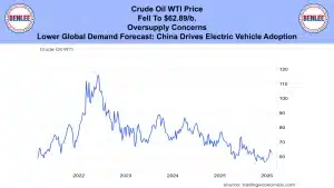 Crude oil WTI price fell to $62.89/b., on oversupply concerns. Also, on a lower global demand forecast as China drives electric vehicle adoption.