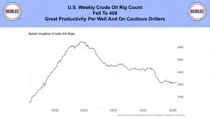The U.S. weekly crude oil rig count fell to 409 on great productivity per well and on cautious drillers.