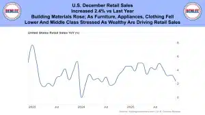 U.S. December retail sales increased 2.4% vs last year. Building materials rose as furniture, appliances and clothing fell. Lower and middle class people are stressed as the wealthy are driving retail sales.