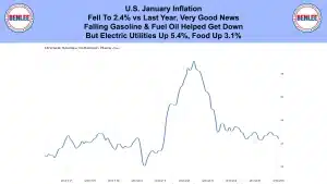 U.S. January inflation fell to 2.4% vs last year, which was very good news. Falling gasoline and fuel oil helped get it down. But electric utilities were up 5.4% and food was up 3.1%.