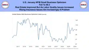 U.S. January NFIB small business optimism index fell to 99.3. This was as real estate improved but as labor quality issues increased. Rising insurance issues are increasingly a problem.