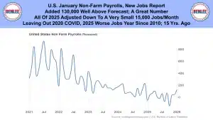U.S. January non-farm payrolls, the new jobs report. The economy added 130,000 jobs, well above forecast and a great number. All of 2025 was adjusted down to a very small 15,000 jobs per month. Leaving out 2020 COVID, 2025 was the worst jobs year since 2010, 15 years ago.