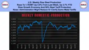 U.S. weekly raw steel production rose to 1.783MT up 4.9% from last week and up 3.7% year to date. This was on the slow growth economy and the 50% steel tariff protection. There was news that the administration might reduce or clarify some metal tariffs.