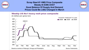 Scrap steel #1 HMS price composite was steady at $388.33/GT on a good balance of supply and demand. Prices could be little change in March.