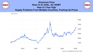 Aluminum price rose to $1.43/lb., $3,145/MT near a three-year high. There remain supply problems from multiple countries that are pushing up prices