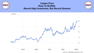 Copper price rose to $6.06/lb., on record high inventories, but record demand.