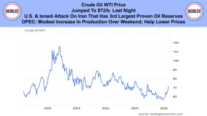 Crude oil WTI price jumped to $72/b. last night on the U.S. and Israeli attack on Iran that has the 3rd highest proven oil reserves. OPEC agreed on a modest increase in production over the weekend that could help lower prices.