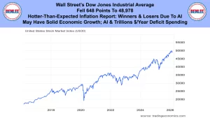 Wall Street’s Dow Jones Industrial Average fell to 648 points to 48,978. This was on the hotter than expected inflation report. There have been winners and losers due to AL. Also, we may have solid economic growth in the coming years due to AI and trillions of dollars per year of deficit spending.