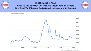 Hot-Rolled coil steel rose to $50.15/cwt., $1,003/MT., up 48% in the past 14 months. This was on the 50% steel tariff protection and a small increase in U.S. demand.