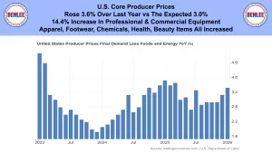 U.S. core producer prices rose 3.6% over last year vs the expected 3.0%. There was a 14.4% increase in professional and commercial equipment. Apparel, Footwear, Chemicals, Health, and beauty items all increased.
