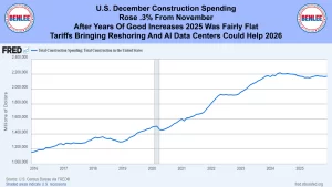 U.S. December construction spending rose .3% from November. After years of good increases, 2025 was fairly flat. Tariffs bringing reshoring and AI data centers could help 2026.