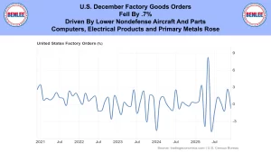 U.S. December factory goods orders, fell by .7%. This was driven by lower non-defense aircraft and parts. Computers, electrical products, and primary metals rose.