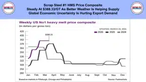 Scrap steel #1 HMS price composite was steady at $388.33/GT as better weather is helping supply. Also, global economic uncertainty is hurting export demand.