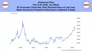 Aluminum price fell to $1.45/lb., $3,195/MT. The #1 consumer China has their demand down this year vs last year. Also, major aluminum production is shut down in Bahrain and Qatar.