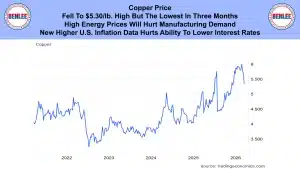 Copper price fell to $5.30/lb., which is high, but the lowest in three months. High energy prices will hurt manufacturing demand. New higher U.S. inflation data hurts the ability to lower interest rates.