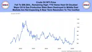 Crude oil WTI price fell to $98.20/b., remaining high. Year to date home heating oil has doubled. Major oil and gas production sites have been destroyed in the Middle East. Markets are not expecting a near term resolution to the conflict.