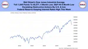 Wall Street’s Dow Jones Industrial Average fell 1,048 point to 45,577 a 4 month low. The S&P hit a 6 month low. This was on escalating destructive actions by the U.S. and Iran. Also, on the Federal Reserve kept intertest rates high this week.
