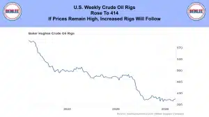 U.S. weekly crude oil rigs rose to 414. If prices remain high increased rigs will follow.