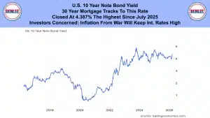 U.S. 10 Year Note Bond Yield. The 30 year mortgage tracks to this rate. It closed at 4.387%, the highest since July 2025. This was caused by investors that are concerned that inflation from the war will keep interest rates high.