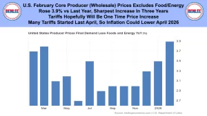 U.S. February Core producer prices which are wholesale prices. Core price excludes food and energy. It rose 3.9% vs last year the sharpest increase in 3 years. Tariffs will hopefully be a one time price increase. Many tariffs started last April, so inflation could lower in April 2026.