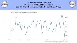 U.S. January new home sales decreased to 587,000 annualized. This was on bad weather, high interest rates and high home prices.