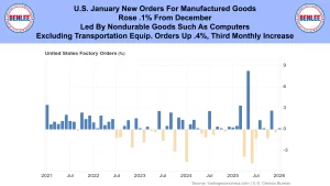 U.S. January new orders for manufactured goods rose .1% from December. This was led by non-durable goods such as computers. Excluding transportation equipment, orders were up .4% the third monthly increase.