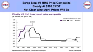 Scrap steel #1 HMS price composite was steady at $388.33/GT. It is not clear what April prices will be.