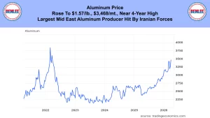 Aluminum price rose to $1.57/lb., $3,468/mt. near a 4 year high. This was as the largest Middle East aluminum producer was it by Iranian forces.