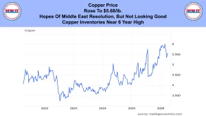 Copper price rose to $5.68/lb. on hopes of a Middle East resolution, but it’s not looking good. Also, copper inventories are near a 6 year high.